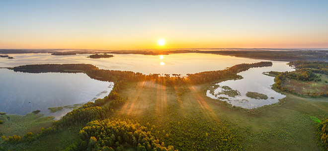 Нарочанский национальный парк в Минской области Беларуси – это целое царство озёр. Около 40 безмятежных, прозрачных окошек можно увидеть с высоты птичьего полёта. Особняком выделяется озеро Нарочь, прозванное Белорусским морем. Это огромное естественное водохранилище входит в шорт-лист популярных курортов для россиян.