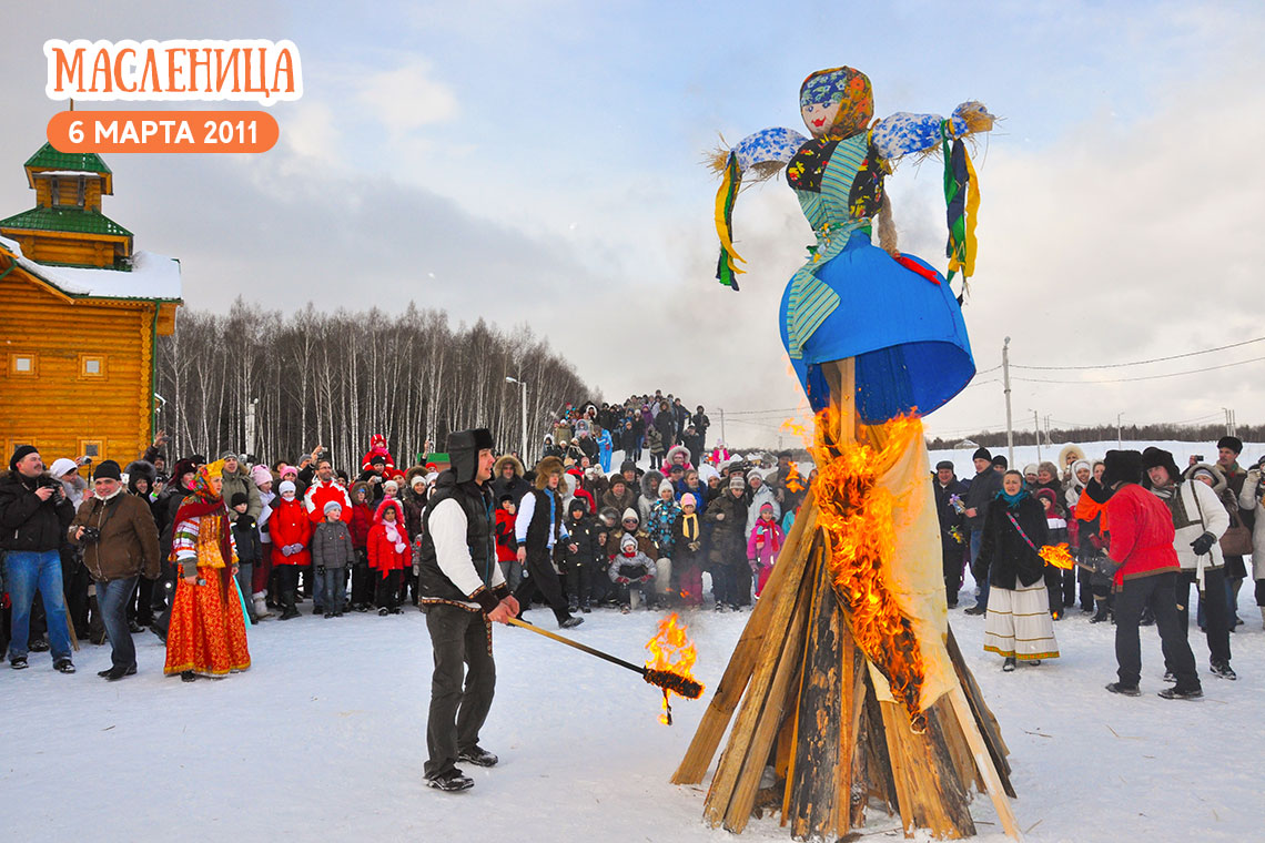 В декабре 2007 года в ЭТНОМИРе официально открылся Музей русской печи, и первая Масленица проводилась тут же – вокруг большой печки. Первое чучело Масленицы было небольшим, всего 2–3 метра высотой, но ярким, устанавливали его на возвышении из снега. После хоровода со скоморохами и дружных закличек – торжественное сожжение!