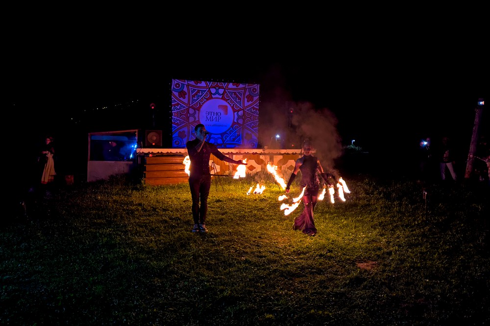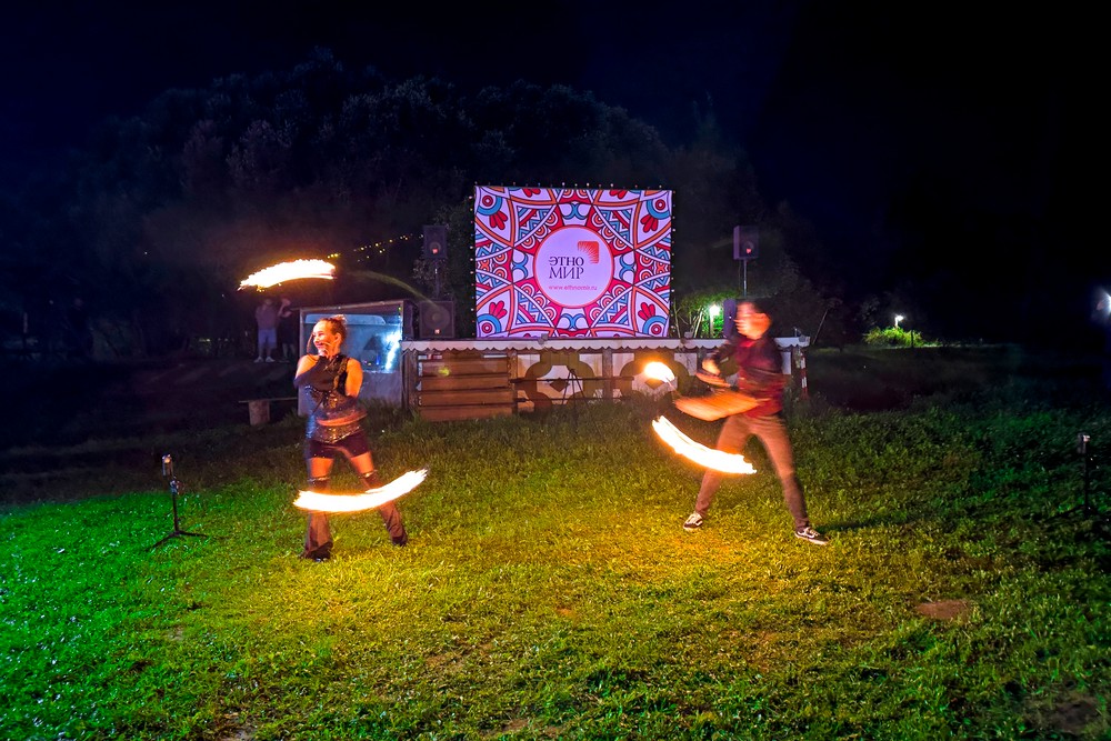 Во время прогулки можно было заглянуть на кулинарный мастер-класс по приготовлению вегетарианских блинчиков, угоститься дынями и арбузами. На площади Дружбы народов собирали аплодисменты артисты Школы восточных танцев из города Жуковского. Творческий коллектив «Нирананда» встречал гостей в Культурном центре Индии. Субботним вечером шоу огней развернулось на поляне ЭТНОМИРа – традиционно низкий поклон профессиональной команде Lando’s Band!