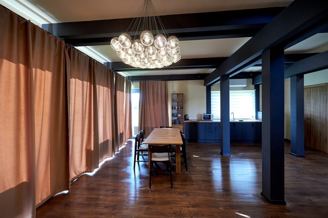 Комплектация дома: 4 односпальные кровати (с возможностью совмещения), 1 угловой диван, столы, стулья, тумбы, вешалки, телефон для внутренней связи, телевизор.