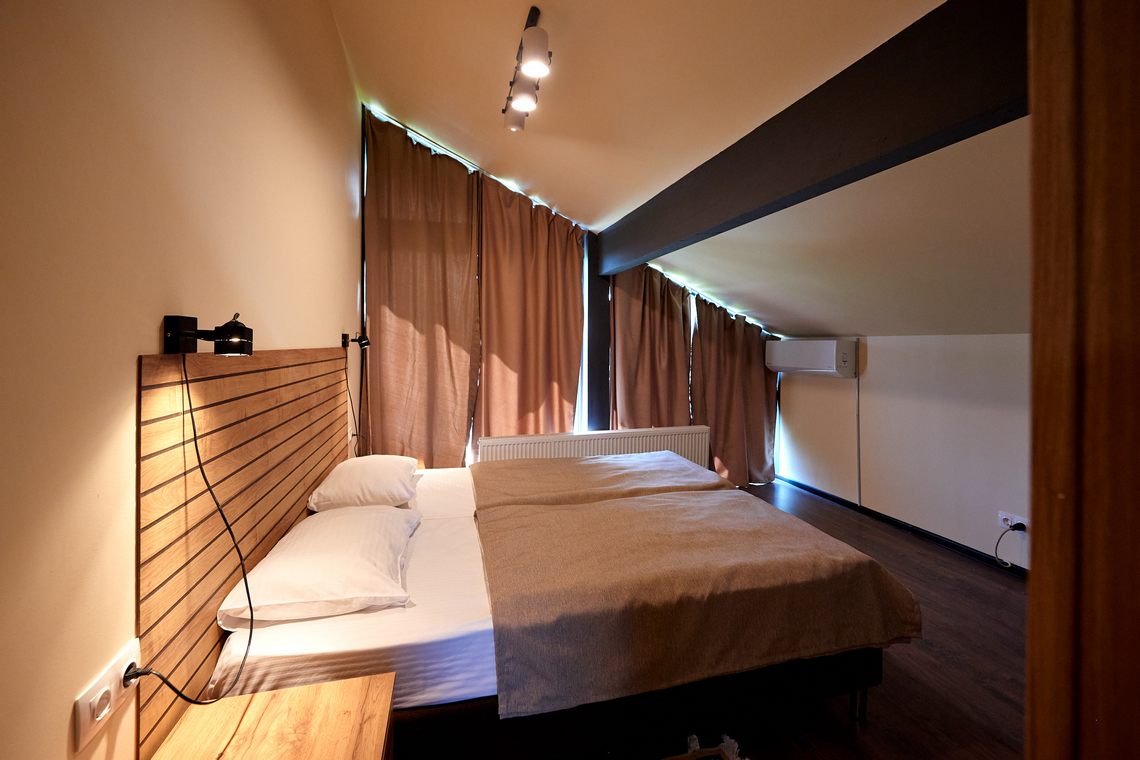 Комплектация номера: одна двуспальная кровать на антресоли, односпальная кровать, диван, тумбы, шкаф, телевизор.