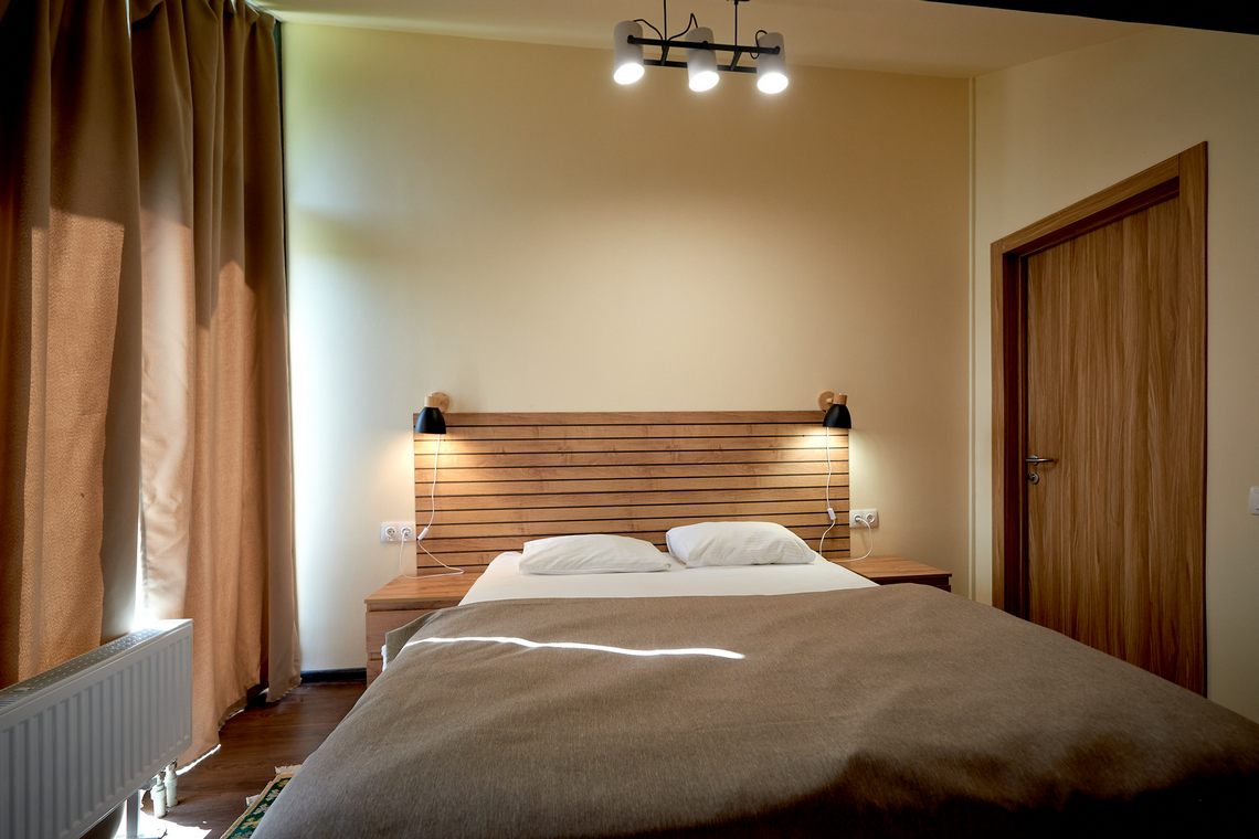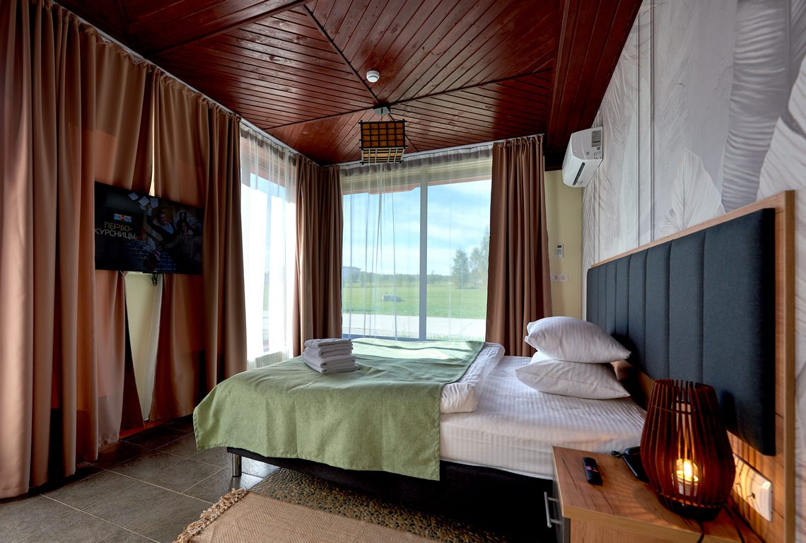 Комплектация номера: 1 двуспальная или 2 односпальные кровати, стол, стулья, шкаф, тумбы, мини-холодильник, чайник, чашки, телефон, напольная вешалка.