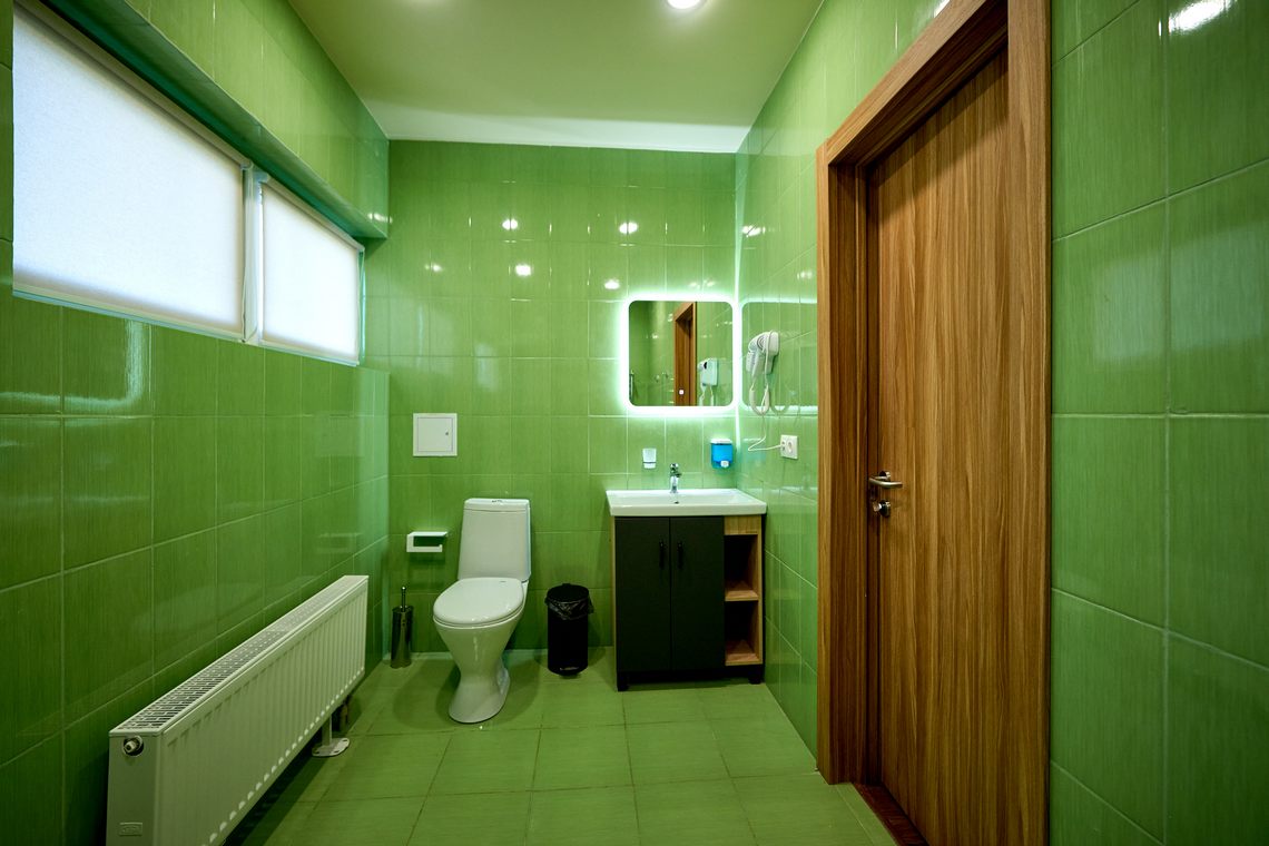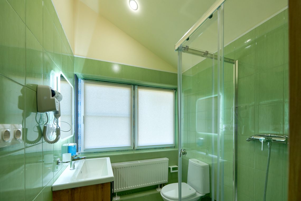 Аксессуары: зеркало, фен, гигиенические принадлежности (гель-шампунь, жидкое мыло в дозаторе), полотенца, тапочки.