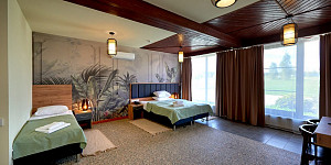 Комплектация номера: 1 двуспальная кровать, 2 односпальные кровати, диван, тумбы, шкаф, телевизор.