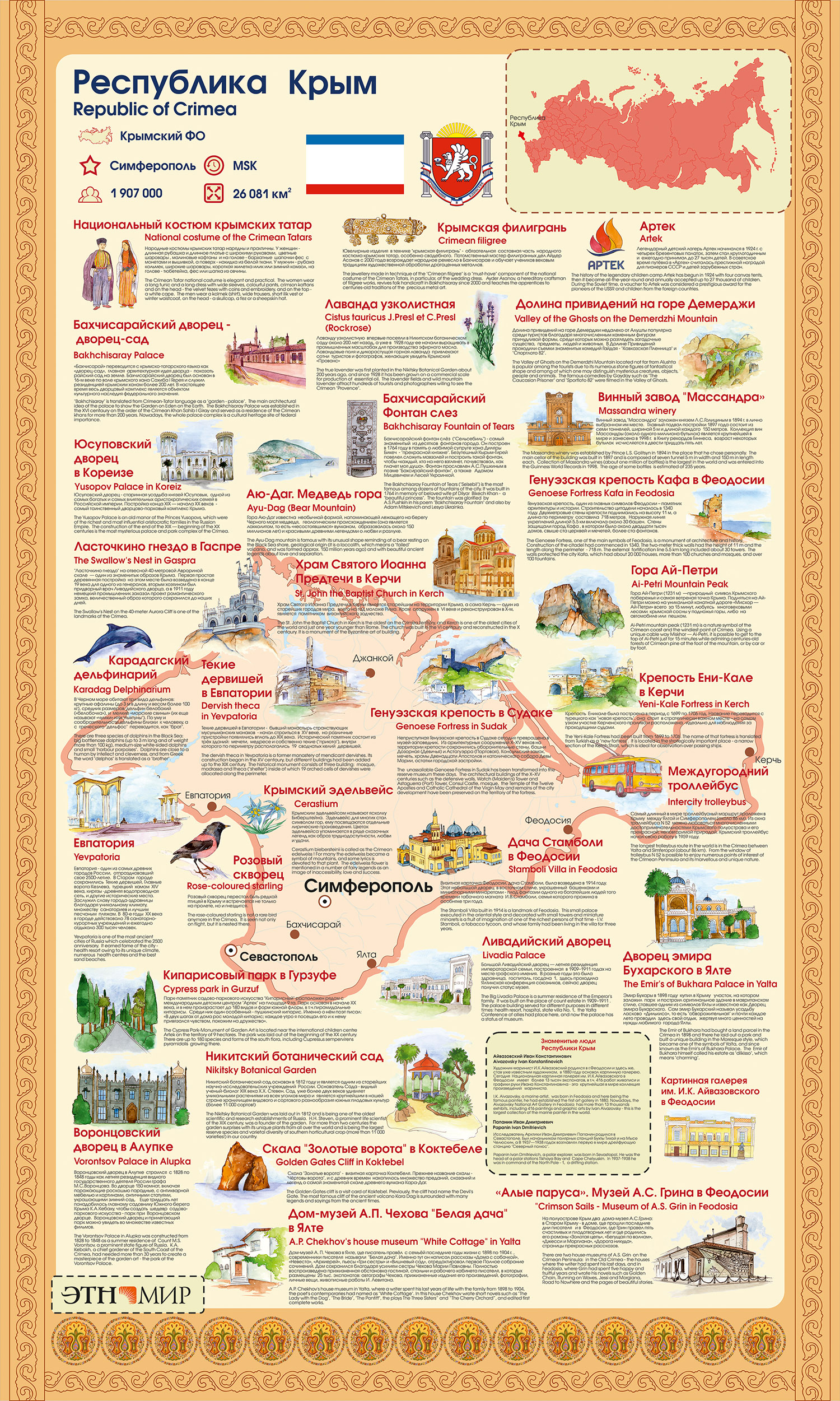 На информационном щите «Республика Крым» отображены далеко не все достопримечательности полуострова, природа Крыма богатейшая, история хранит немало крутых поворотов.