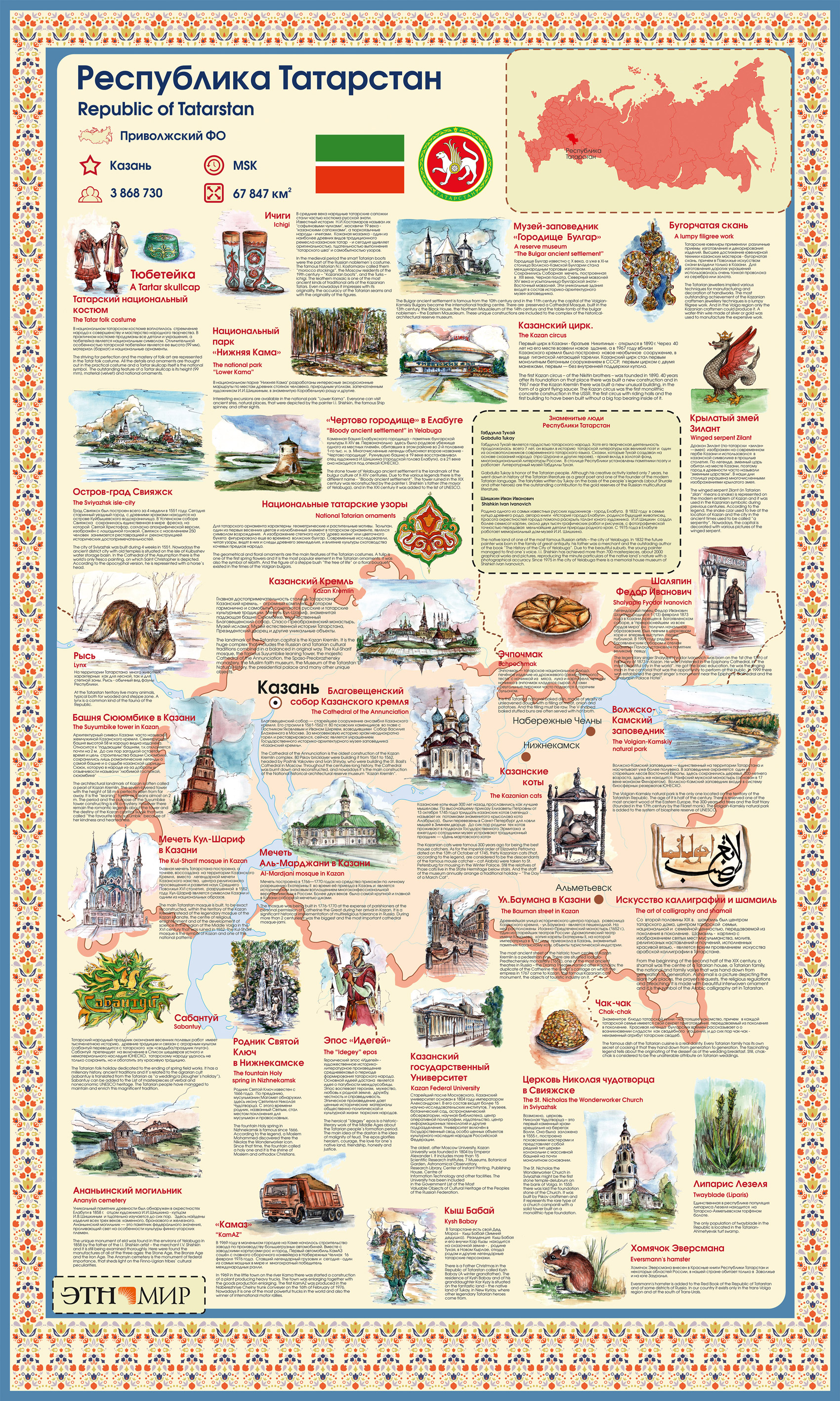 В галерее «Путешествие по России», что в этнографическом-парке-музее «ЭТНОМИР», все 85 субъектов федерации представлены информативно и красочно. Гостям этнопарка особенно нравится аттракцион с поиском своего родного региона и изучением всех представленных на стенде локальных брендов. Что вы уже знали, о чём подзабыли - приезжайте гулять по парку, расширять кругозор, восполнять пробелы в знании своей и других стран!
