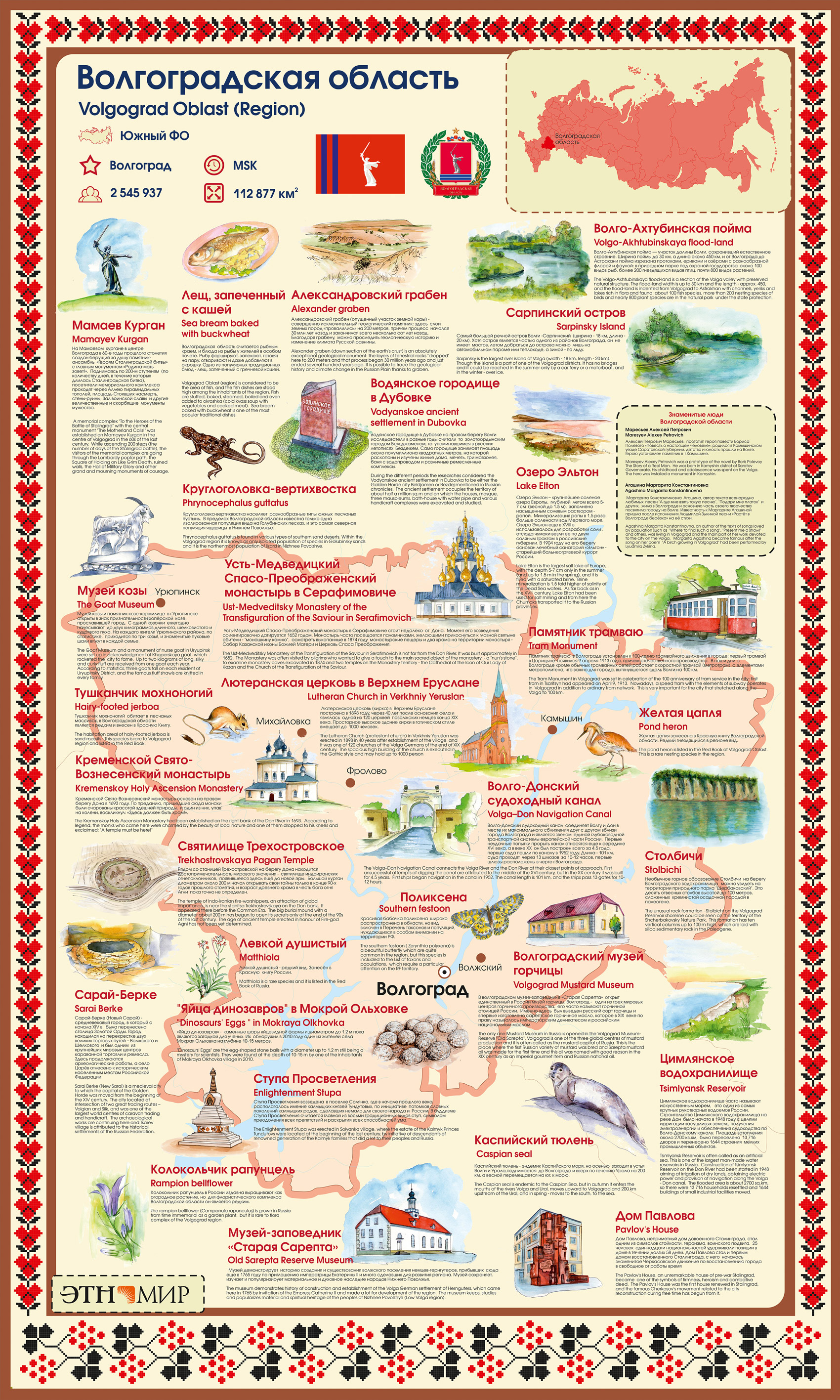 В галерее «Путешествие по России», что в этнографическом-парке-музее «ЭТНОМИР», все 85 субъектов федерации представлены информативно и красочно. Гостям этнопарка особенно нравится аттракцион с поиском своего родного региона и изучением всех представленных на стенде локальных брендов. Что вы уже знали, о чём подзабыли - приезжайте гулять по парку, расширять кругозор, восполнять пробелы в знании своей и других стран!