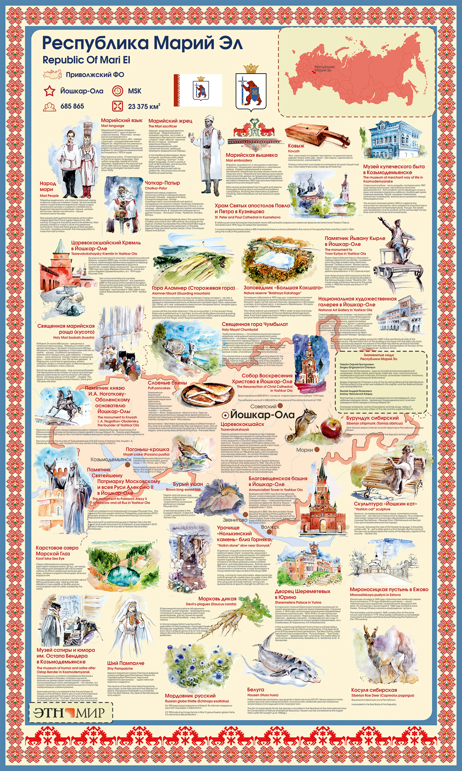 Инфощит «Республика Марий Эл» – это иллюстрированный рассказ о достопримечательностях республики, входящей в состав Приволжского федерального округа. Разглядывая этот стенд, вы узнаете о народном герое-богатыре Чоткаре, о марийской вышивке и смычковом инструменте ковыж, о священной горе Чумбылат и трёслойных марийских блинах команмелна, о карстовом озере «Морской глаз» и Музее сатиры и юмора им. Остапа Бендера в Козьмодемьянске.