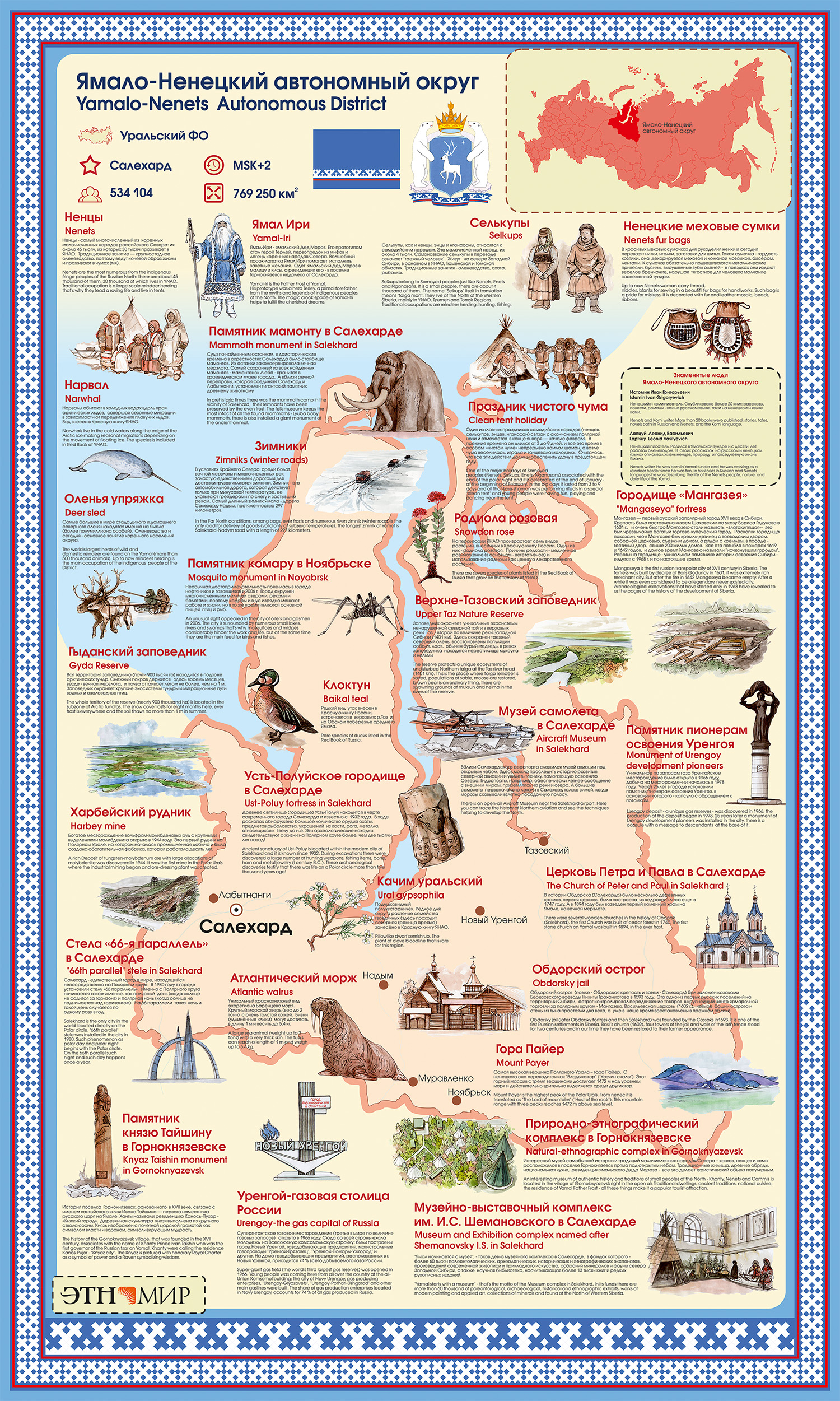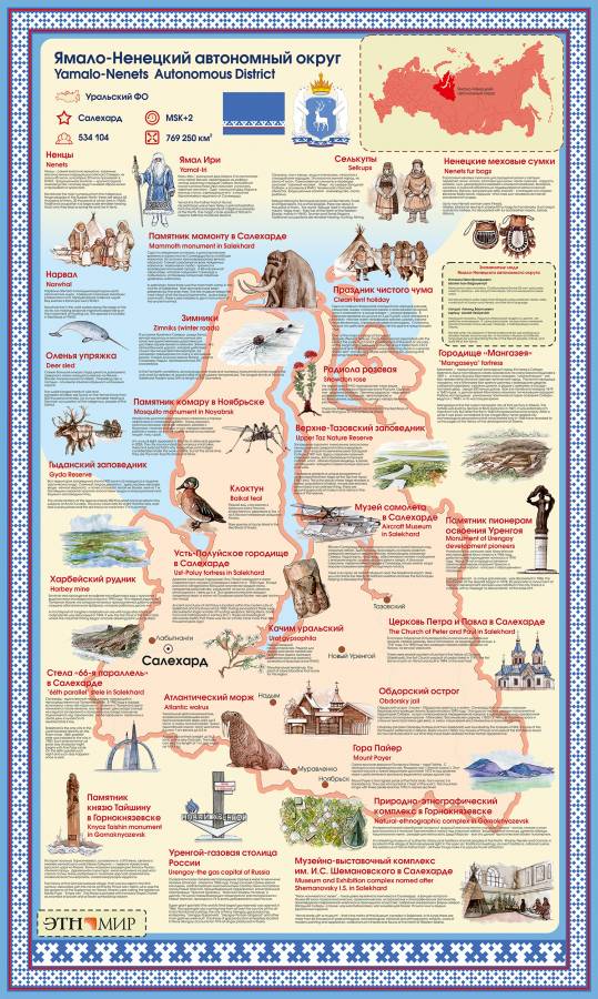 Познакомьтесь с инфощитом, посвящённым Ямало-Ненецкому автономному округу: знаменитые места, люди, памятники, музеи и заповедники, представители животного и растительного мира.