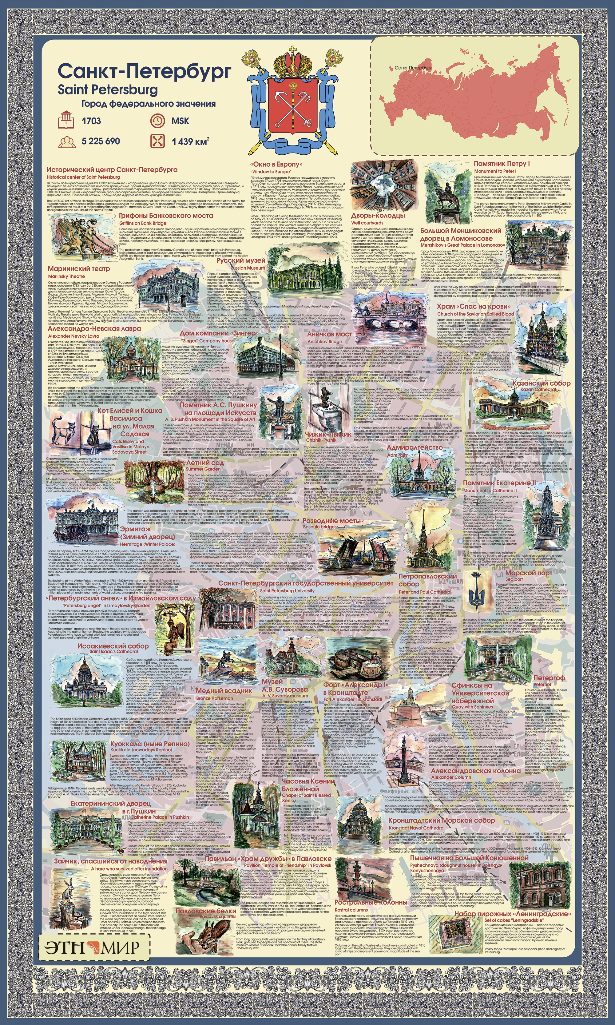 Познакомьтесь с инфощитом, посвящённым Санкт-Петербургу, рассмотрев все указанные на нём достопримечательности, знаковые места, памятники и явления. Приезжайте гулять по этнографическому парку, расширять кругозор, восполнять пробелы в знании своей и других стран!