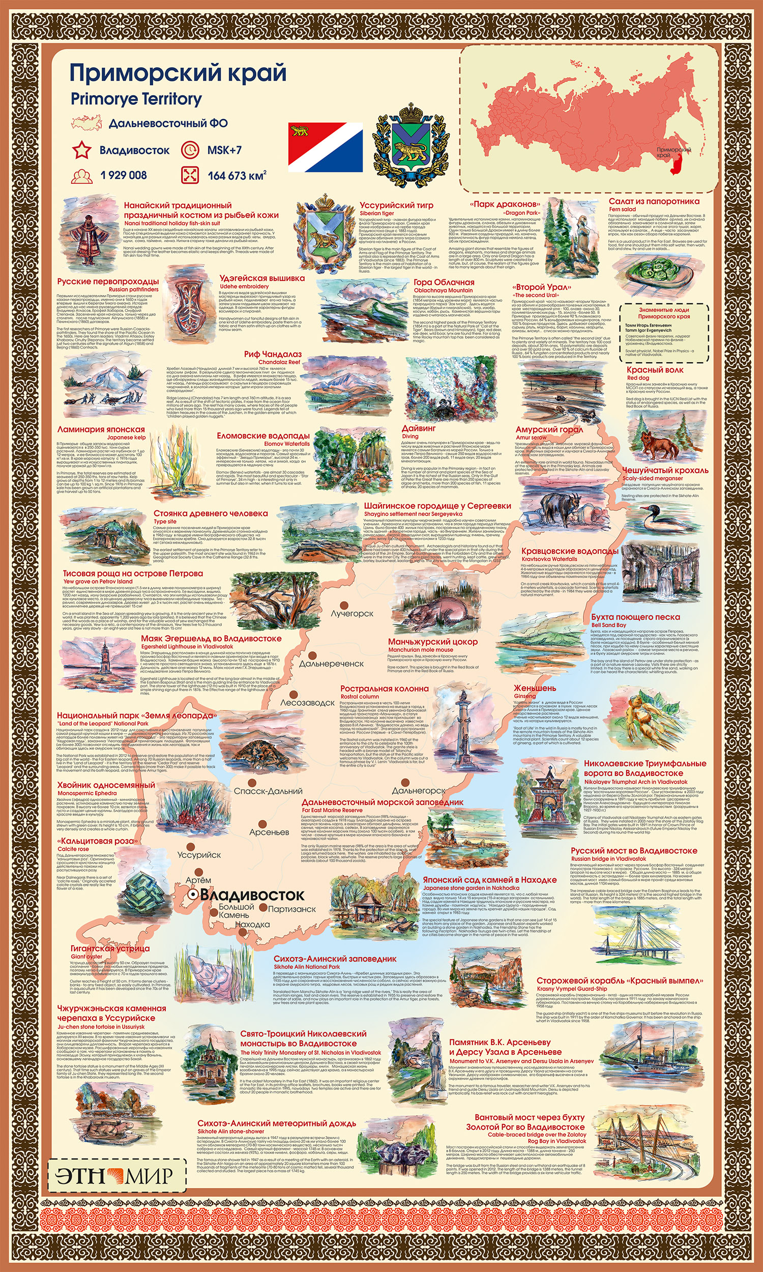 Горы Приморского края представляют собой один длинный гранитный пояс Сихотэ-Алинь. В южной его части горные хребты образуют полуостров Муравьёва-Амурского, самый крупный в заливе Японского моря. На нём и расположился Владивосток – столица Приморья и Ворота в Азию. Этот город-порт обладает величием Властителя морей и интересен путешественникам своими азиатскими мотивами.