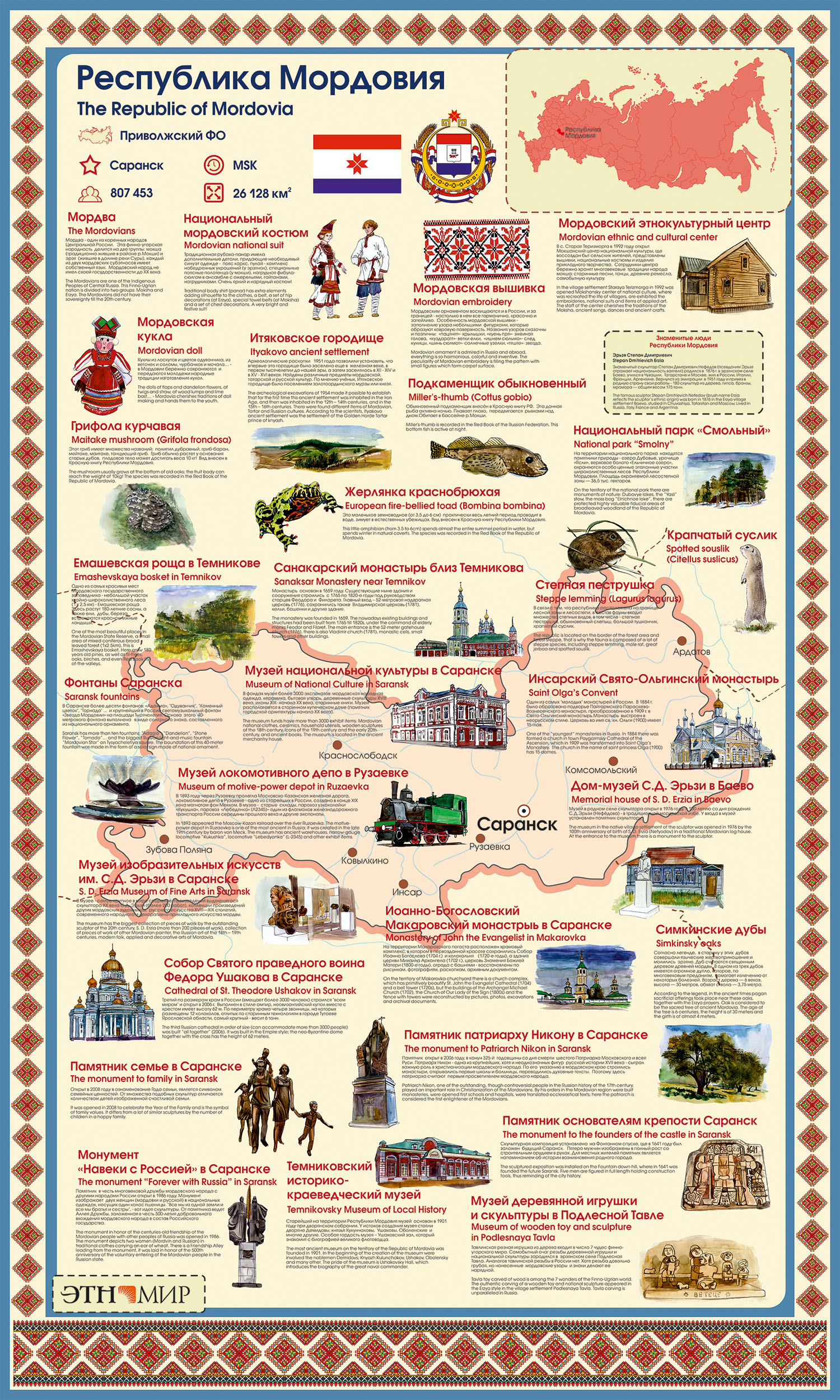 Инфощит «Республика Мордовия» – это иллюстрированный рассказ о достопримечательностях края. Из коротких заметок вы узнаете о национальном мордовском костюме, особенностях мордовской вышивки и традиционных куколках. Прочитаете о музеях, храмах, памятниках Саранска. О краснокнижных представителях флоры и фауны.