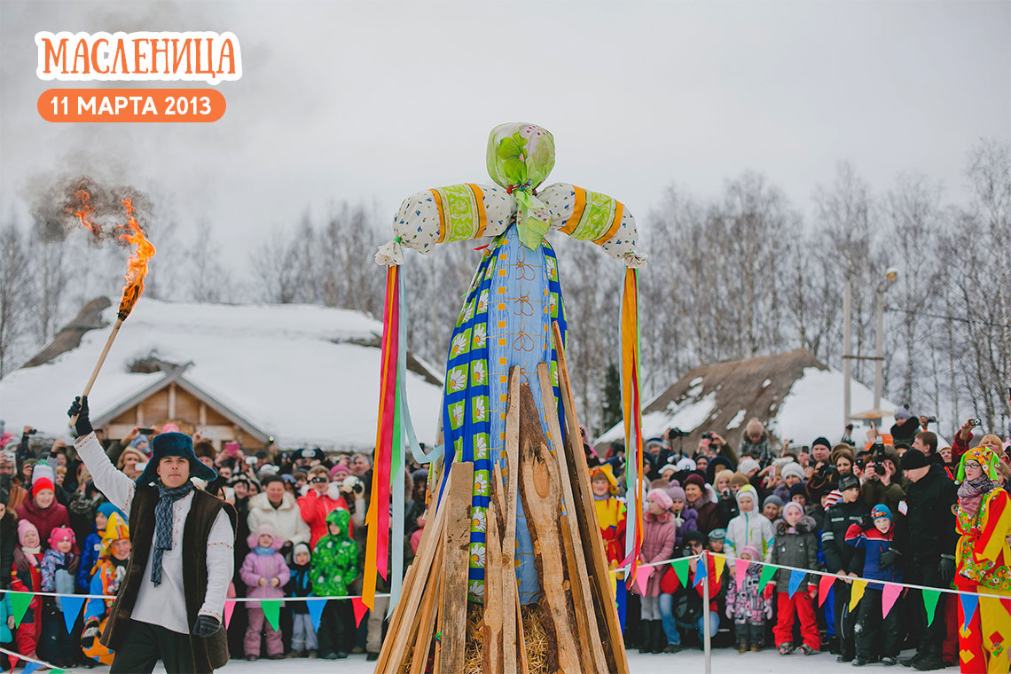 В декабре 2007 года в ЭТНОМИРе официально открылся Музей русской печи, и первая Масленица проводилась тут же – вокруг большой печки. Первое чучело Масленицы было небольшим, всего 2–3 метра высотой, но ярким, устанавливали его на возвышении из снега. После хоровода со скоморохами и дружных закличек – торжественное сожжение!