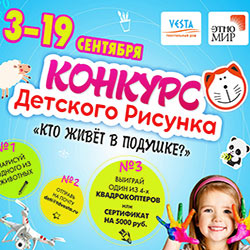 Культурно-образовательный туристический центр «ЭТНОМИР» совместно с текстильным домом «VESTA» объявляют о запуске конкурса детского рисунка «Кто живёт в подушке?». К участию приглашаются дети от 6 до 17 лет, желающие раскрыть свой творческий потенциал и выиграть фантастические подарки: сертификат на посещение этнопарка «ЭТНОМИР» всей семьёй, квадрокоптер с камерой, сертификат на 5 000 рублей на покупки товаров в интернет-магазине текстильного дома «VESTA» и другие приятные призы! Присылайте свои работы с 3 по 21 сентября 2016, участвуйте и выигрывайте!