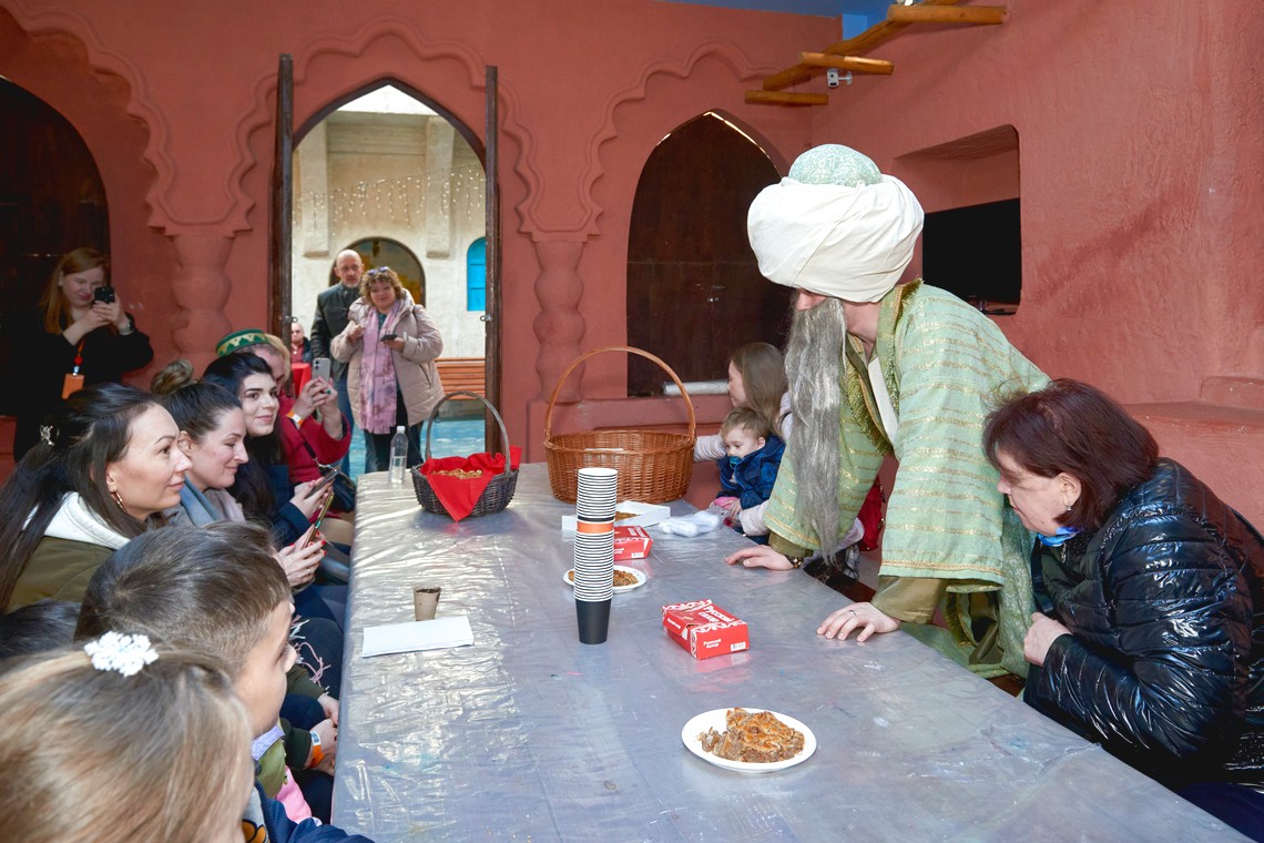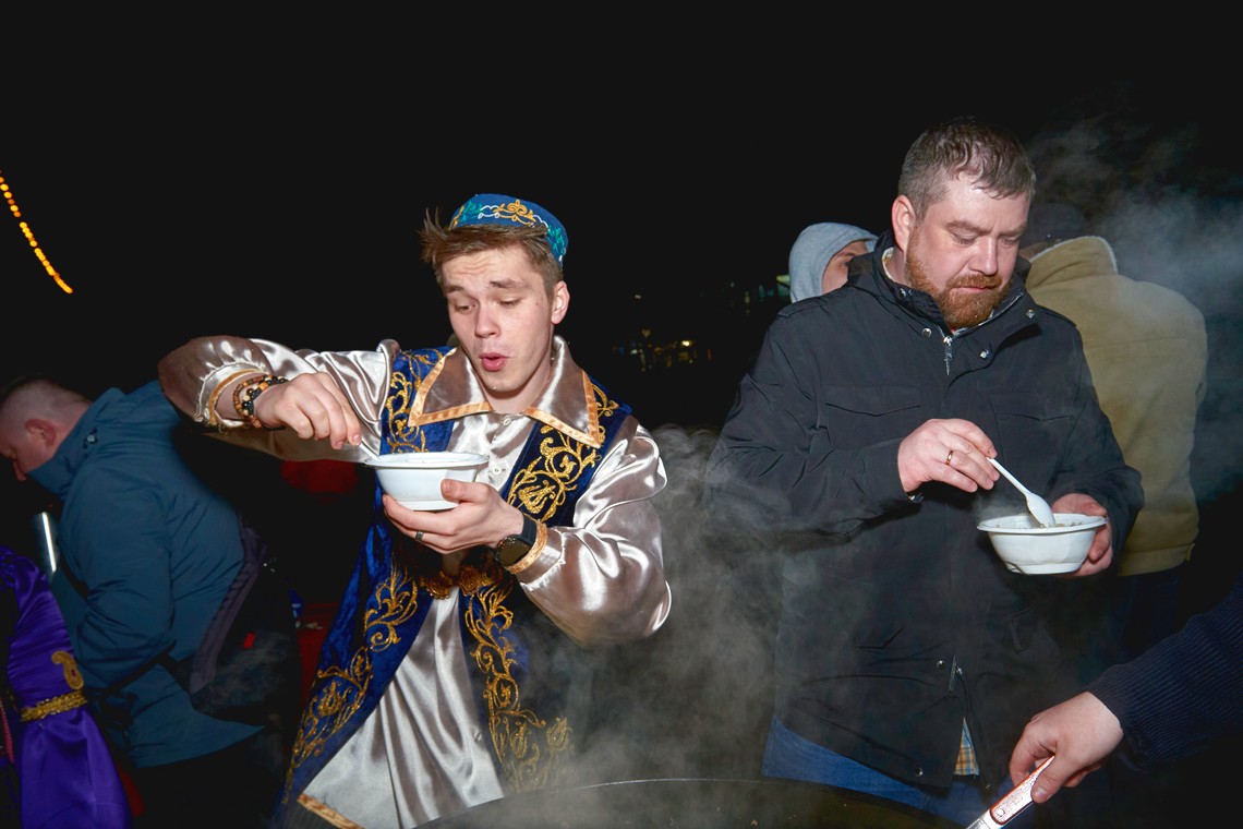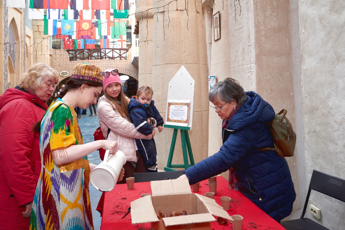 Традиционный праздник весны и начала нового солнечного года в ЭТНОМИРе состоялся под аккомпанемент солнечной погоды, знаменующей наступление тёплого сезона: в битве сугробов и солнечных лучей побеждают последние. Мы угощались пахлавой и сумаляком, готовили плов, знакомились с обычаями Навруза, мастерили сувениры, сажали тюльпанчики – приезжайте посмотреть на цветение, когда взойдут! Одной из тематических площадок Навруза в парке была «Тамаша» (с татарского – зрелище, представление) – и мы благодарны артистам за атмосферу, которую, благодаря костюмам и ярким выступлениям, удалось создать на празднике. На дневном концерте на площади Дружбы народов и на вечернем, около большой печки и в окружении изб, выступали творческий коллектив Башкирского культурного центра – ансамбль «Ак тирмэ», а также ансамбль «Браво» (Чувашия).