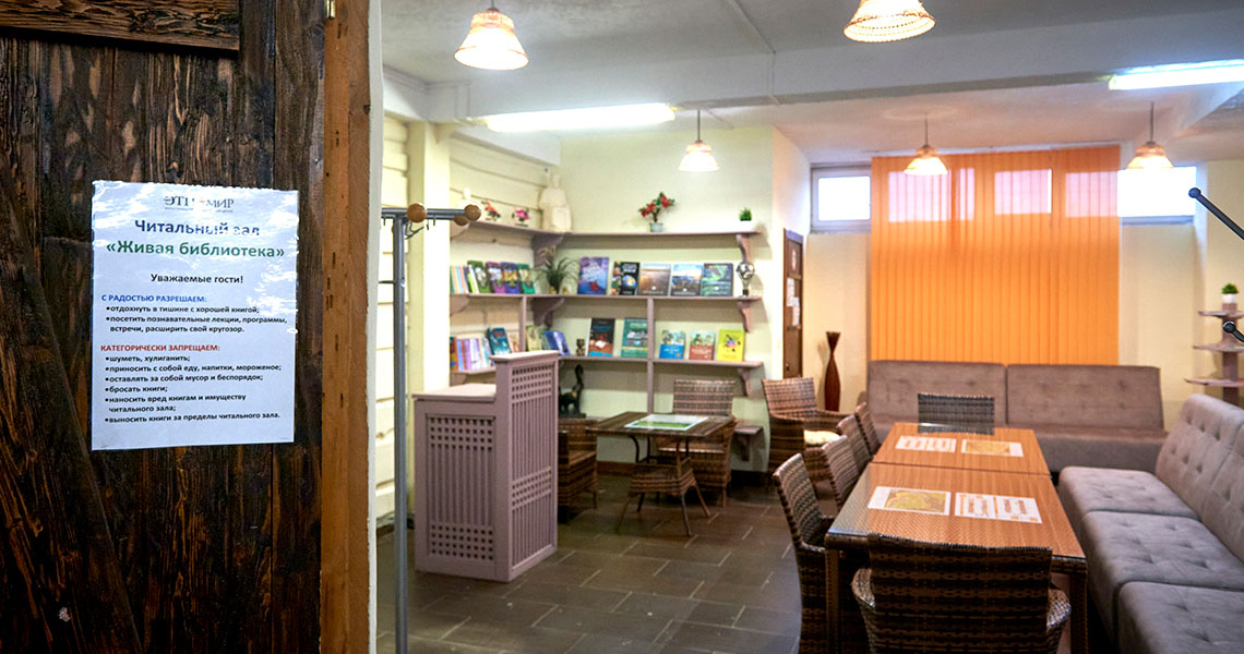 ЭТНОМИР – живой организм: в парке постоянно обновляются экспозиции, меняется содержание локаций, появляются новые объекты. Так для проведения культурно-образовательных программ, лекций, литературных встреч и общения появилось новое пространство «Живая библиотека». Здесь также можно посидеть в тишине, взять с полки книгу и почитать.